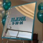 Custom LED Seating Card Display, with Custom Star Fold Over Logo Place Cards, Gift Box and Balloon Trees for Bat Mitzvah Decor